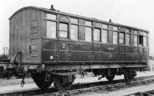 Bought from GWR. Formerly Taff Vale Railway. 4-wheeled with two 2nd class compartments, luggage section and guard’s compartment. Carried only 20 passengers. Was painted dark green. Shown also in old photo in Then & Now -Walton Park. |
