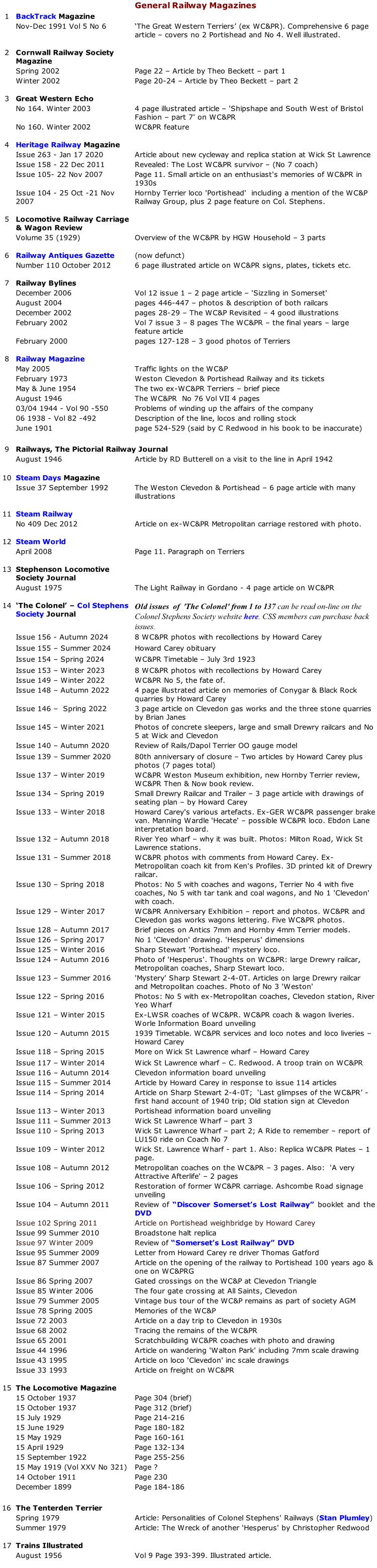 It is intended that this page will list as many as possible of the magazine articles that have featured the WC&P Railway. Please let me know of any I’ve missed. Contact. Magazines are listed alphabetically, firstly general railway magazines, then modelling magazines. See www.magazineexchange.co.uk for old magazines for sale. |