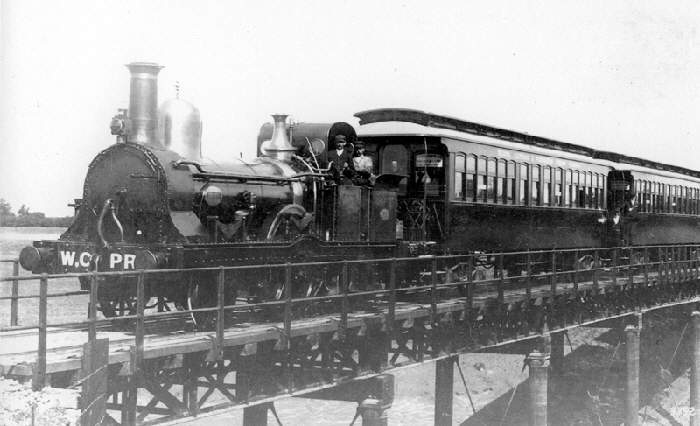 Train hauled by loco ‘Weston’ crossing Yeo bridge in 1899 |