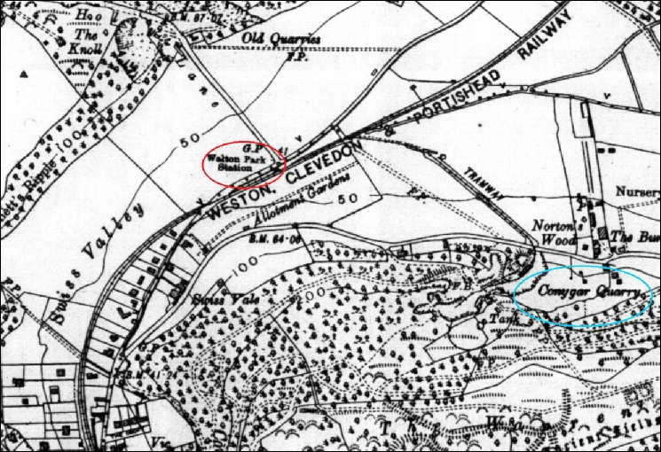 Walton Park halt is marked with a red ellipse and Conygar quarry with a blue ellipse.